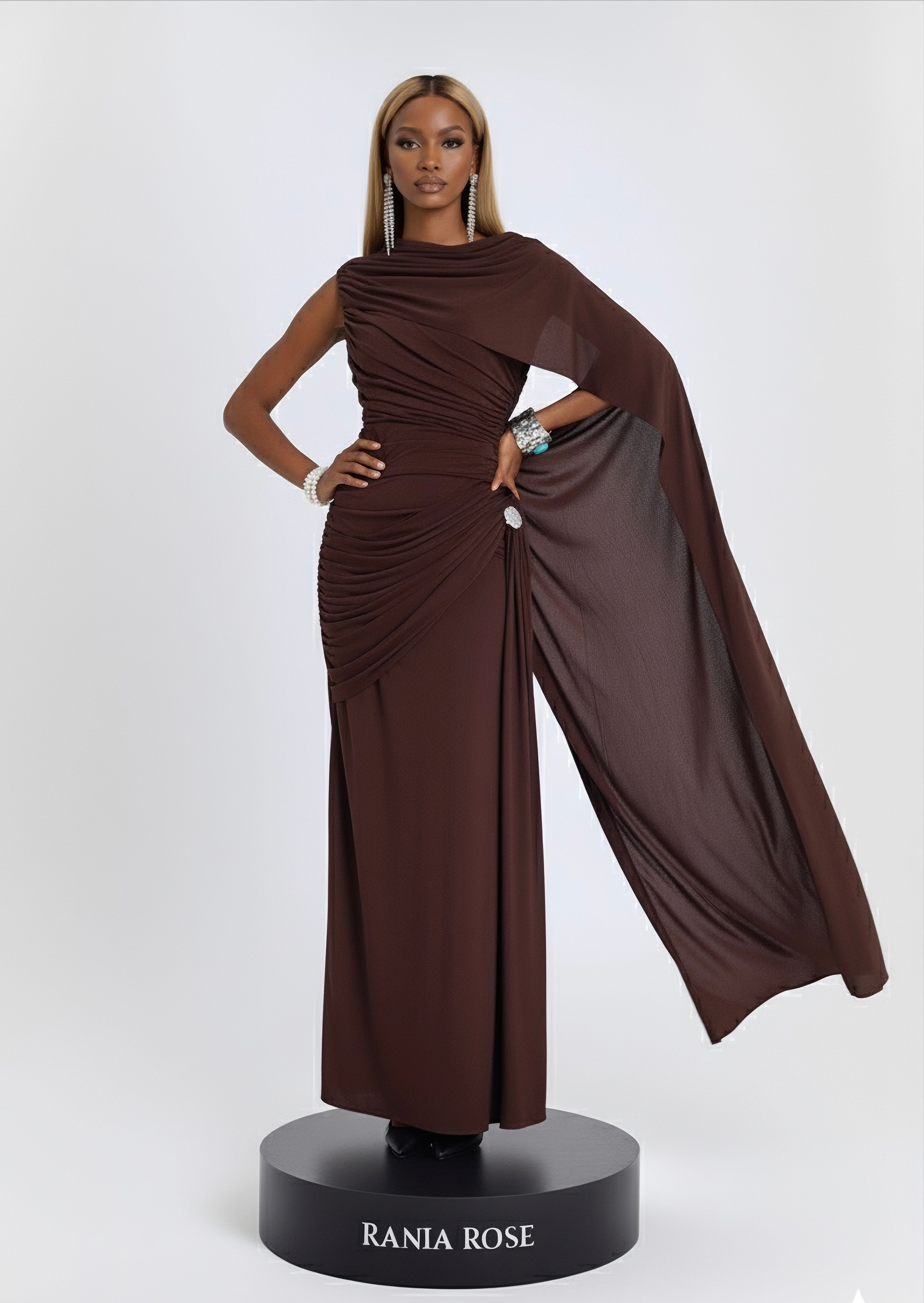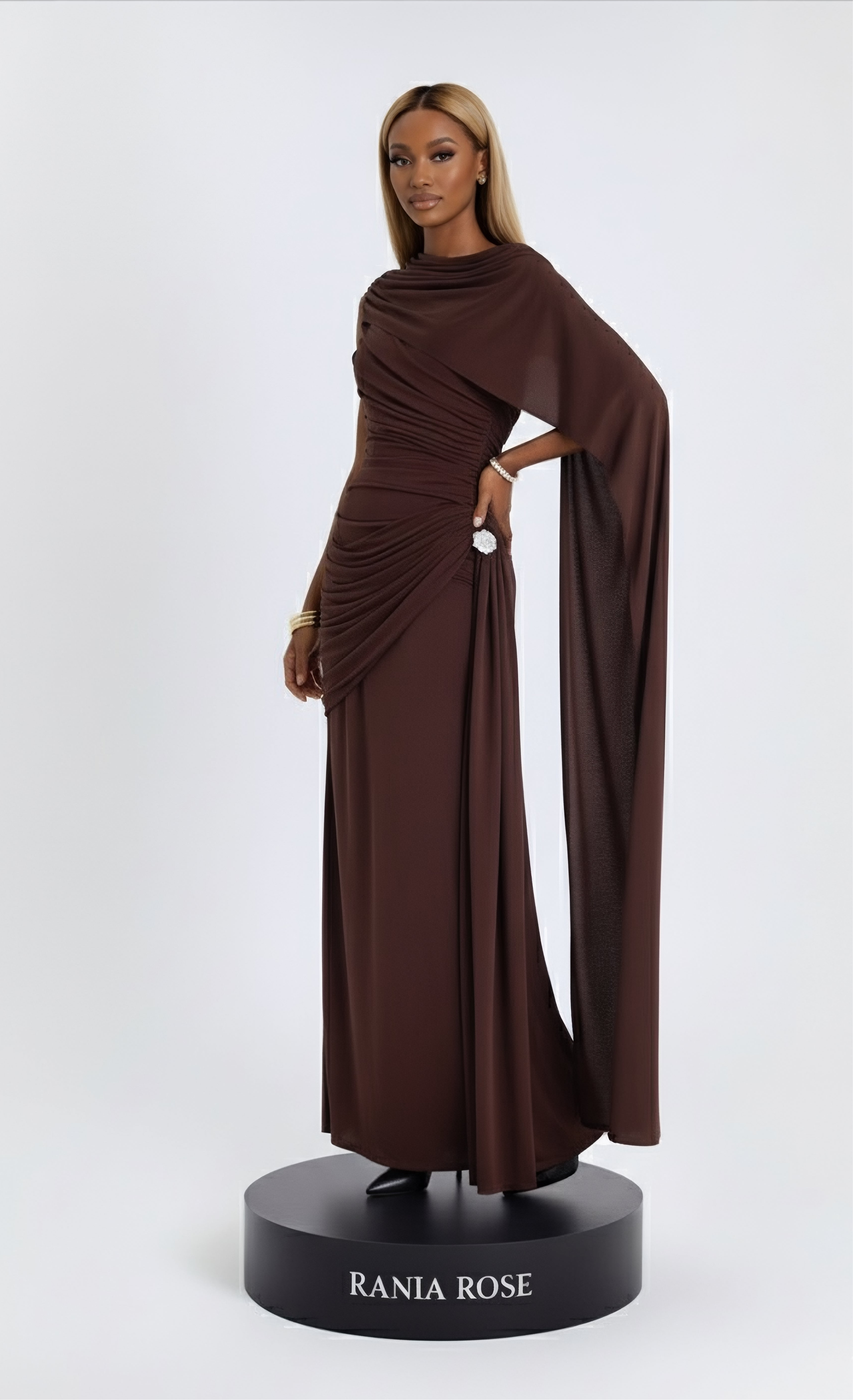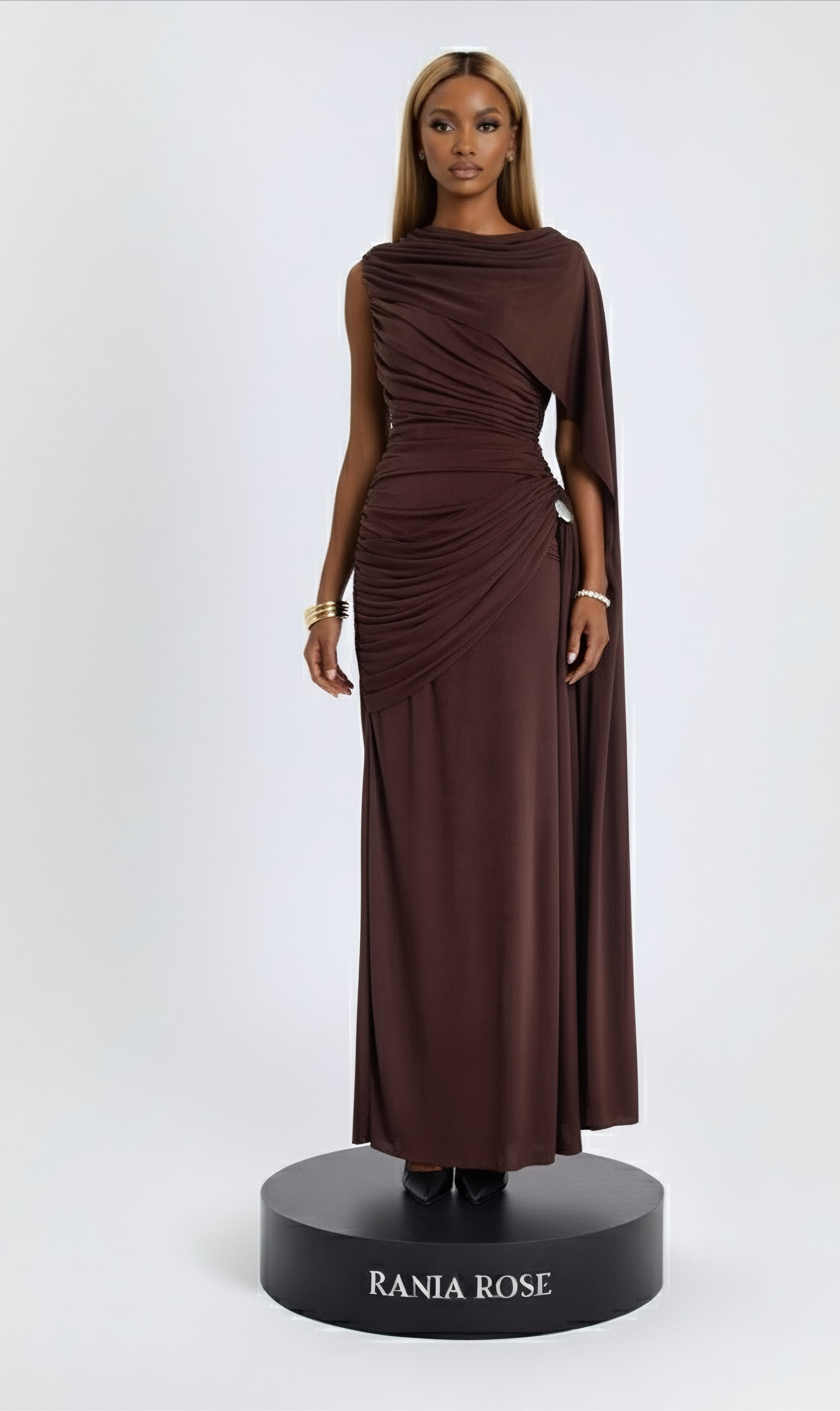 She moved like poetry, the soft sweep of Nora’s drape gliding with every step. Cut from an exclusive lightweight suede fabric sourced for its velvety touch and fluid elegance, this gown feels as luxurious as it looks. The sculpted, ruched bodice wraps the figure in a flattering embrace, while the asymmetric shoulder and dramatic drape create a silhouette that is both statuesque and effortlessly modern.The side gathering draws the eye to the waist before falling into a sleek, floor-skimming skirt—every fold and line intentionally placed to accentuate your natural shape. Rich in texture and depth, the chocolate brown hue elevates its sophistication, making Nora as unforgettable as the moment you enter the room.