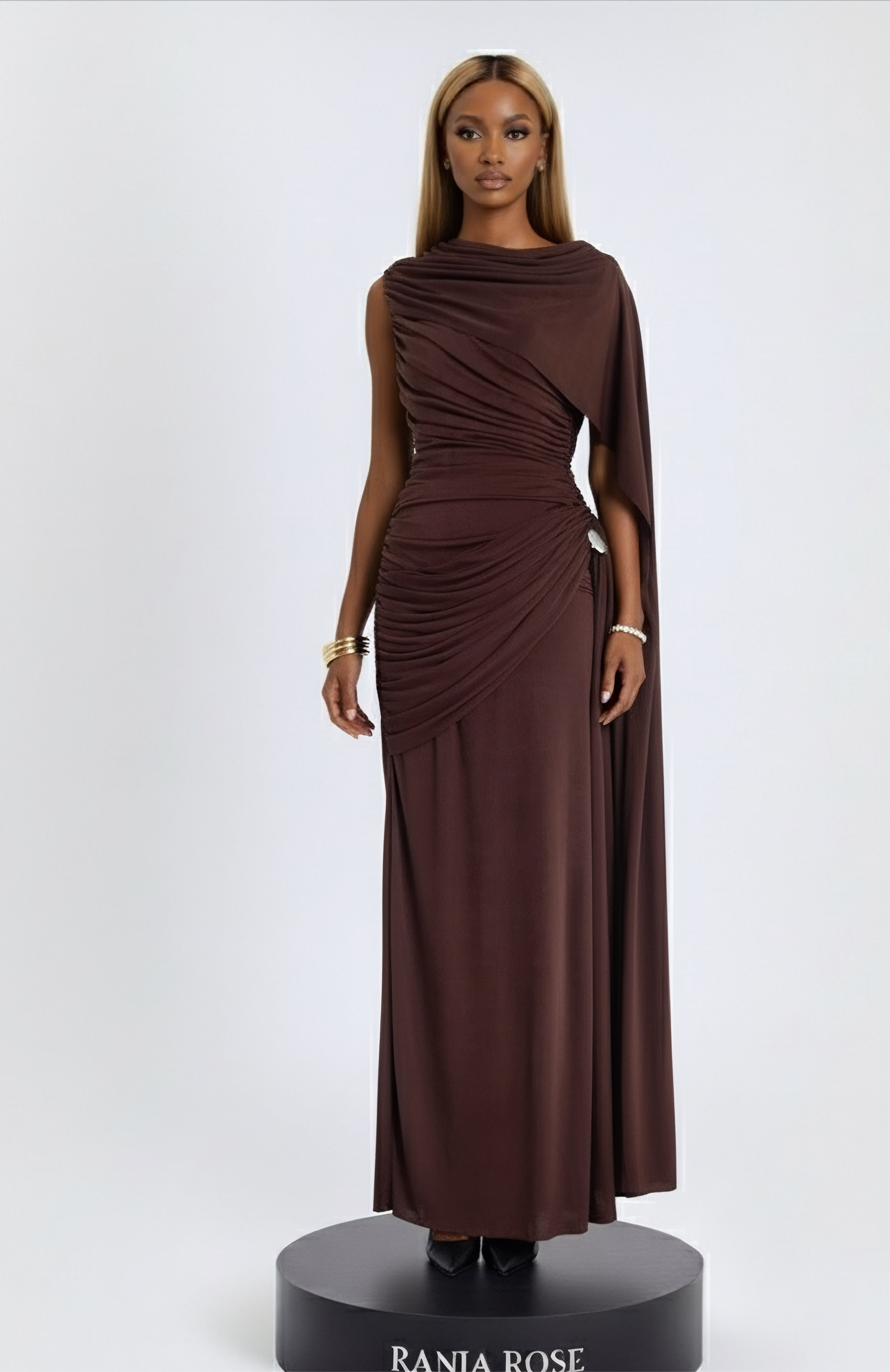 The side gathering draws the eye to the waist before falling into a sleek, floor-skimming skirt—every fold and line intentionally placed to accentuate your natural shape. Rich in texture and depth, the chocolate brown hue elevates its sophistication, making Nora as unforgettable as the moment you enter the room.